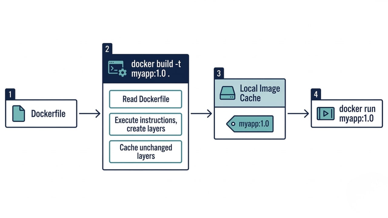 docker build reads your Dockerfile and executes each instruction in order, producing a tagged image you can run as containers. The basic syntax is: