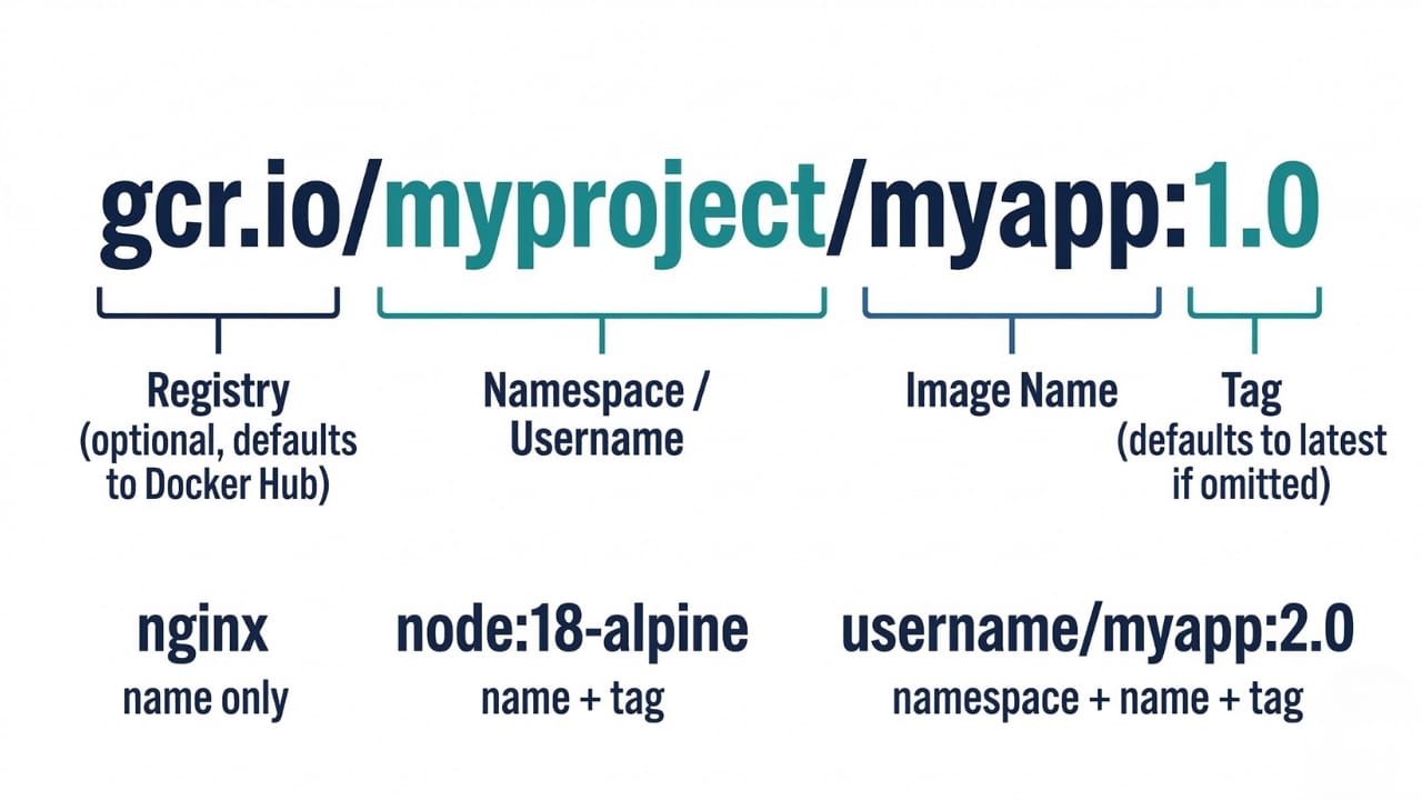 [registry/][namespace/]name[:tag]. Tags default tolatestif omittedlatestis not automatically the newest version of an image. It's simply the last image pushed without an explicit tag. Never rely onlatestin production deploymentsUse semantic versioning for tags (