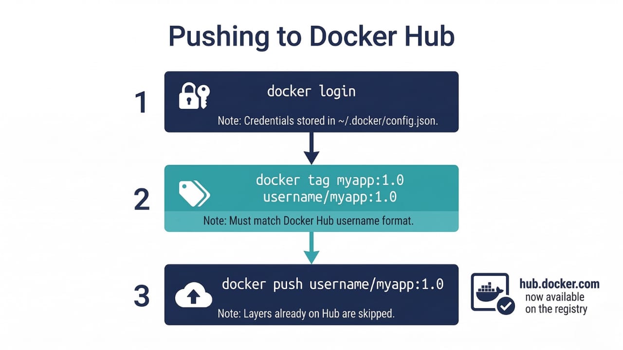 echo $DOCKER_PASSWORD | docker login -u $DOCKER_USERNAME --password-stdinUsing --password-stdin instead of -p prevents your password from appearing in shell history or process listings. In CI/CD pipelines, always use this form with credentials stored as environment secrets.