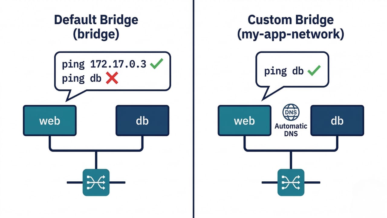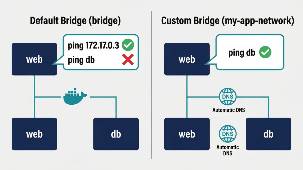 The default bridge network has one critical limitation: no automatic DNS resolution. Containers can only reach each other by IP address, not by name.
