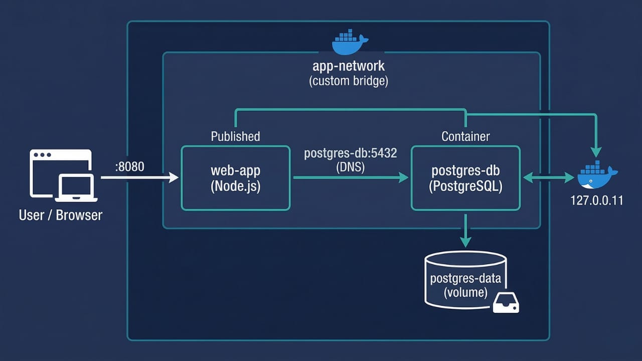 Also notice the volume on the database container. Combining a custom network for connectivity with a named volume for persistence is the standard pattern for any stateful service in Docker.