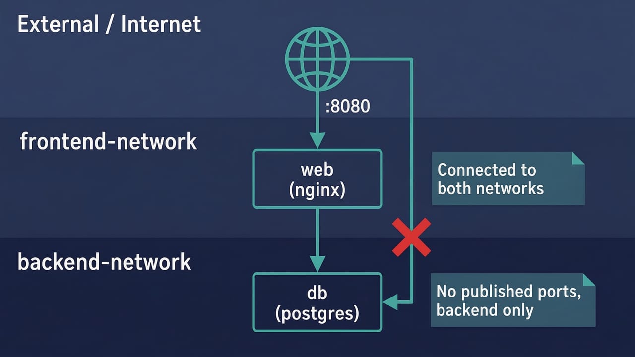 postgresNow web can reach db through backend-network, and external users can reach web through the published port on frontend-network. But db has no published ports and isn't on frontend-network, so external traffic and frontend-only containers can't reach it directly.