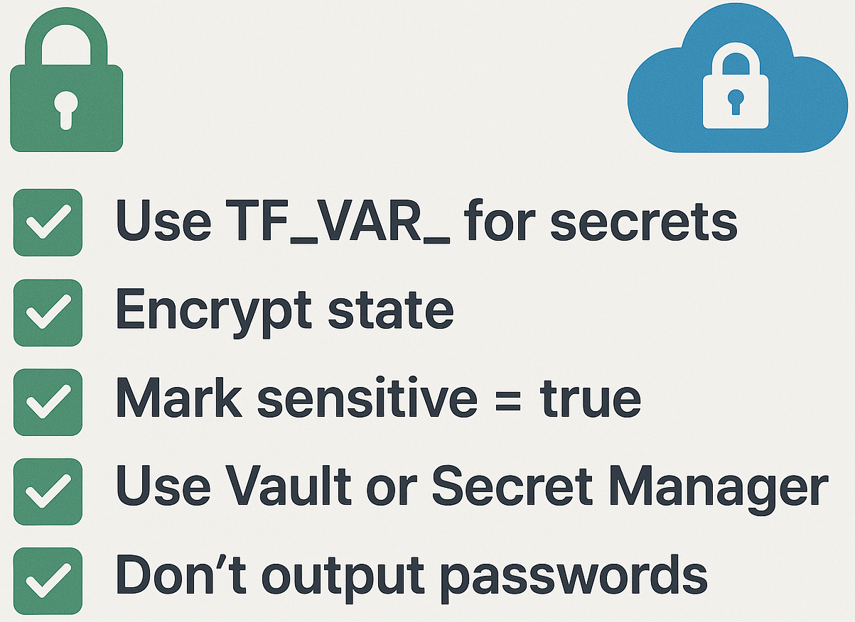 ✅ Use environment variables or secret managers — not raw .tf