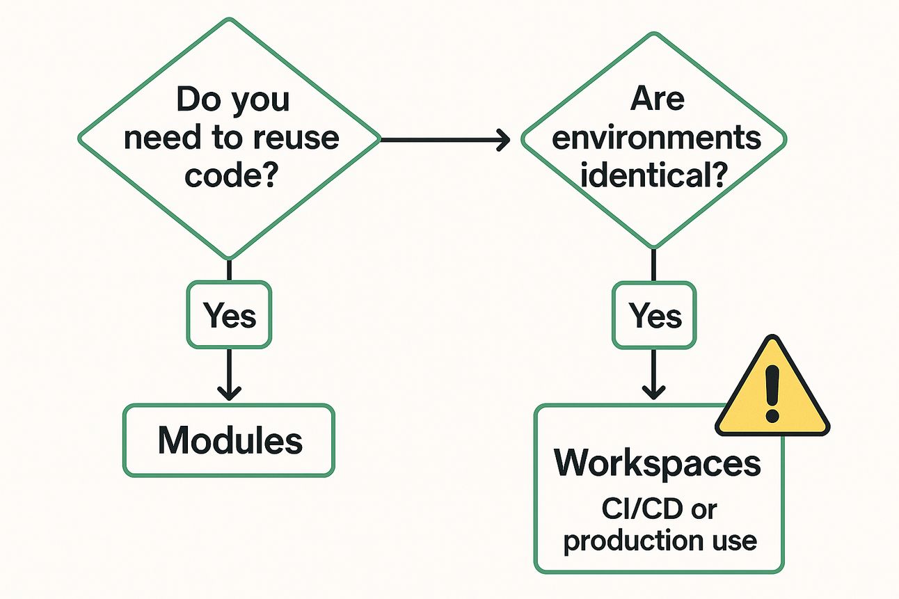 Modules scale your code. Workspaces isolate your state. Confusing the two leads to bad automation and worse debugging.